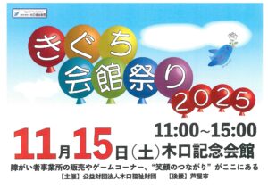 TOP > イベント情報一覧 > きぐち会館祭り2025 きぐち会館祭り2025 日時 令和7年11月15日(土) 午前11時~午後3時 会場 木口記念会館 (芦屋市呉川町14-10) 内容 *障がい者事業所の販売やゲームコーナー 主催 公益財団法人木口福祉財団 後援 芦屋市 木口会館祭りPDF イベント情報一覧へ