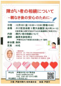 TOP > イベント情報一覧 > 障がい者の相続について~親なき後の安心のために~ 障がい者の相続について~親なき後の安心のために~ 日時 令和7年12月5日(金) 午前10時半~正午 会場 木口記念会館3階大会議室 (芦屋市呉川町14-10) 内容 障がい者の相続について 講師 藤原克彦税理士 (芦屋市立みどり地域生活支援センター監事) 参加費 無料 定員 60名 申込 芦屋市手をつなぐ育成会 E-mail:info@ikusei.club FAX:0797-35-1214(小野) 11月25日(火) 主催 芦屋市障がい団体連合会 後援 芦屋市 相続pdf イベント情報一覧へ