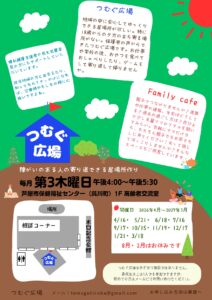 ※つむぐ広場はあずかり施設ではありません。高校生以上は一人でも参加できますが、初めての方はメールにてお問合せください。 ※アレルギーをお持ちの方は必ずお申し出ください。 ※つむぐ広場では、損害保険には加入していません。ご心配な方はご自身でご加入をお願いいたします。 |